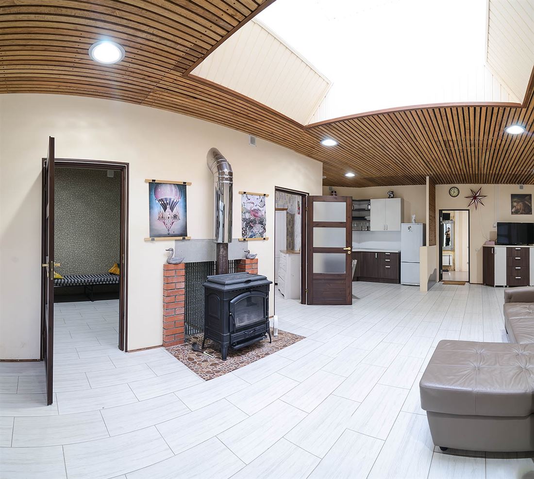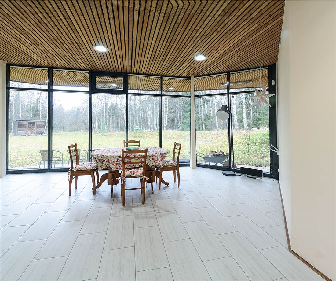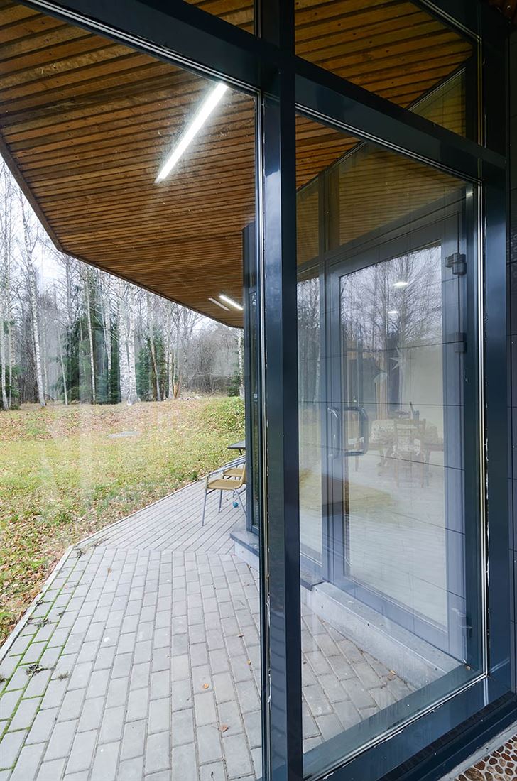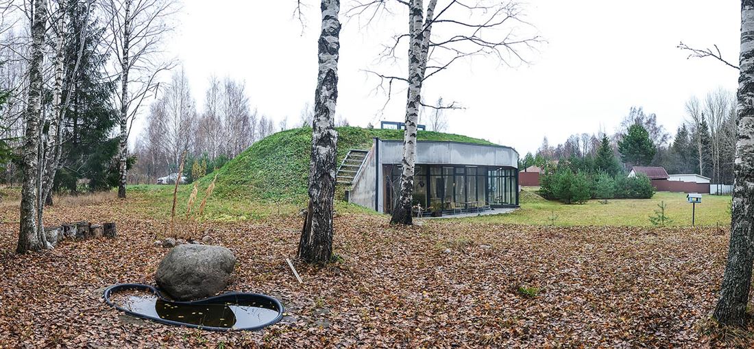 Дом максимально интегрирован в окружающую среду, визуально спрятан в глубине холма. Большая часть стены по периметру – панорамное окно со стеклами, удерживающими тепло. Смотровое окно есть и в потолке, таким образом, сидя у камина, можно любоваться и пробегающими облаками, и вековым лесом.