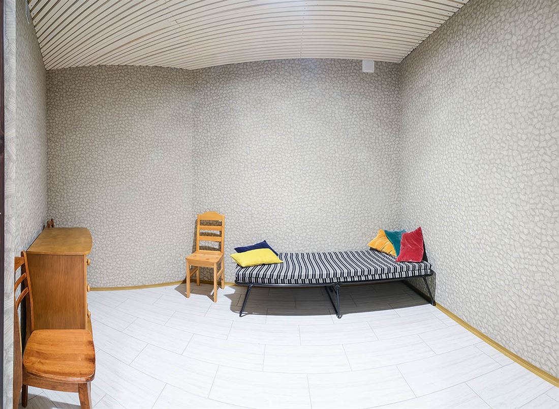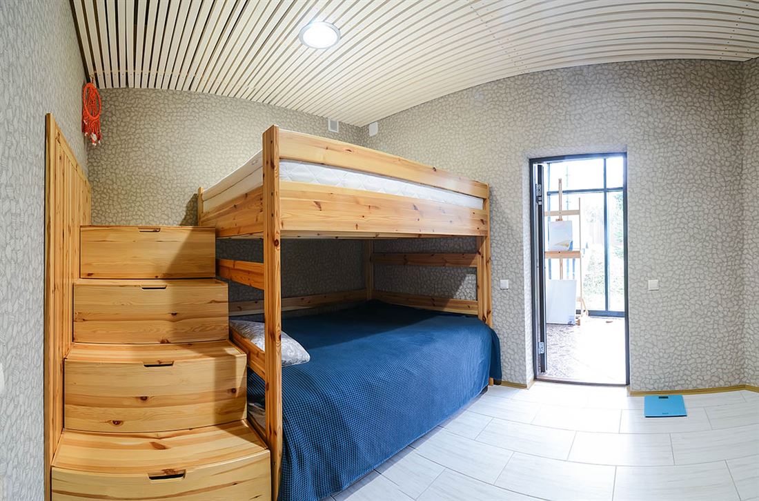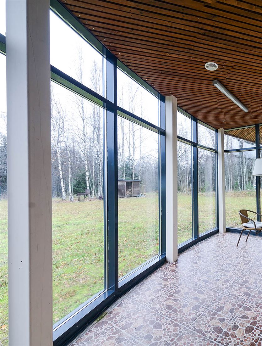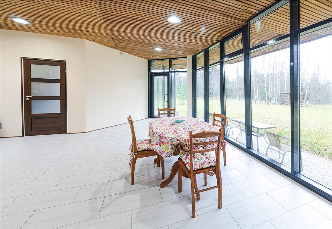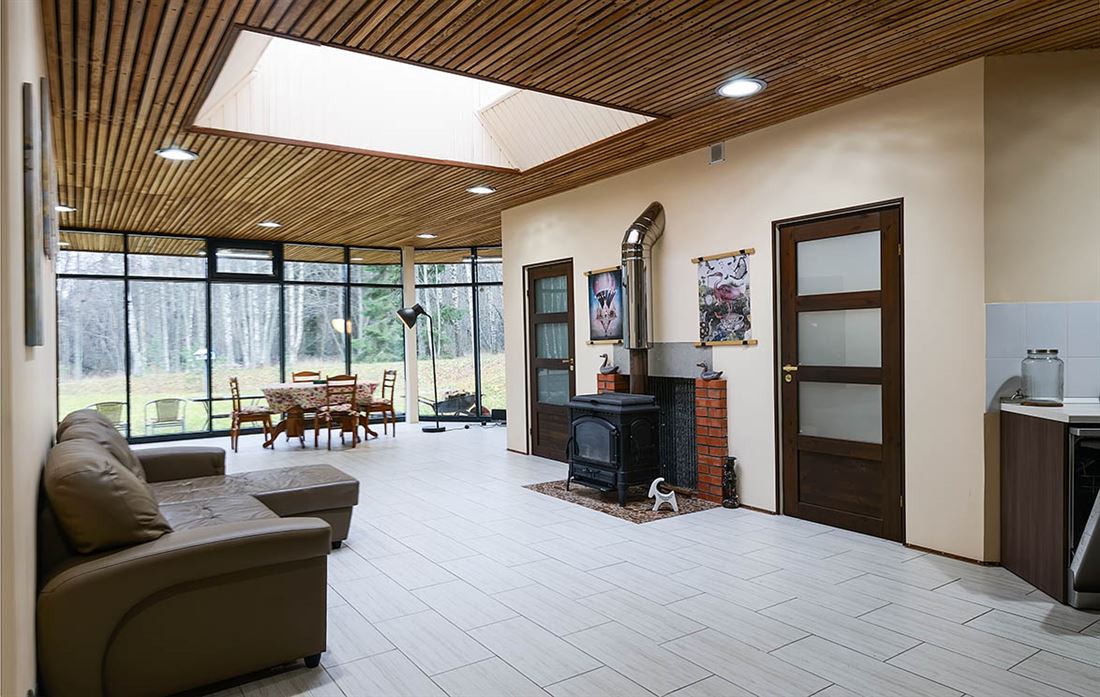 Дом максимально интегрирован в окружающую среду, визуально спрятан в глубине холма. Большая часть стены по периметру – панорамное окно со стеклами, удерживающими тепло. Смотровое окно есть и в потолке, таким образом, сидя у камина, можно любоваться и пробегающими облаками, и вековым лесом.