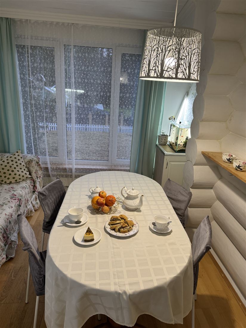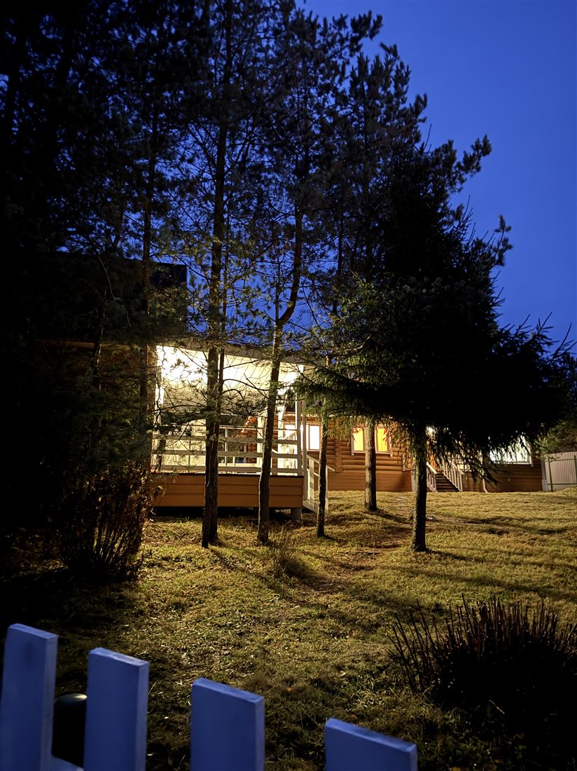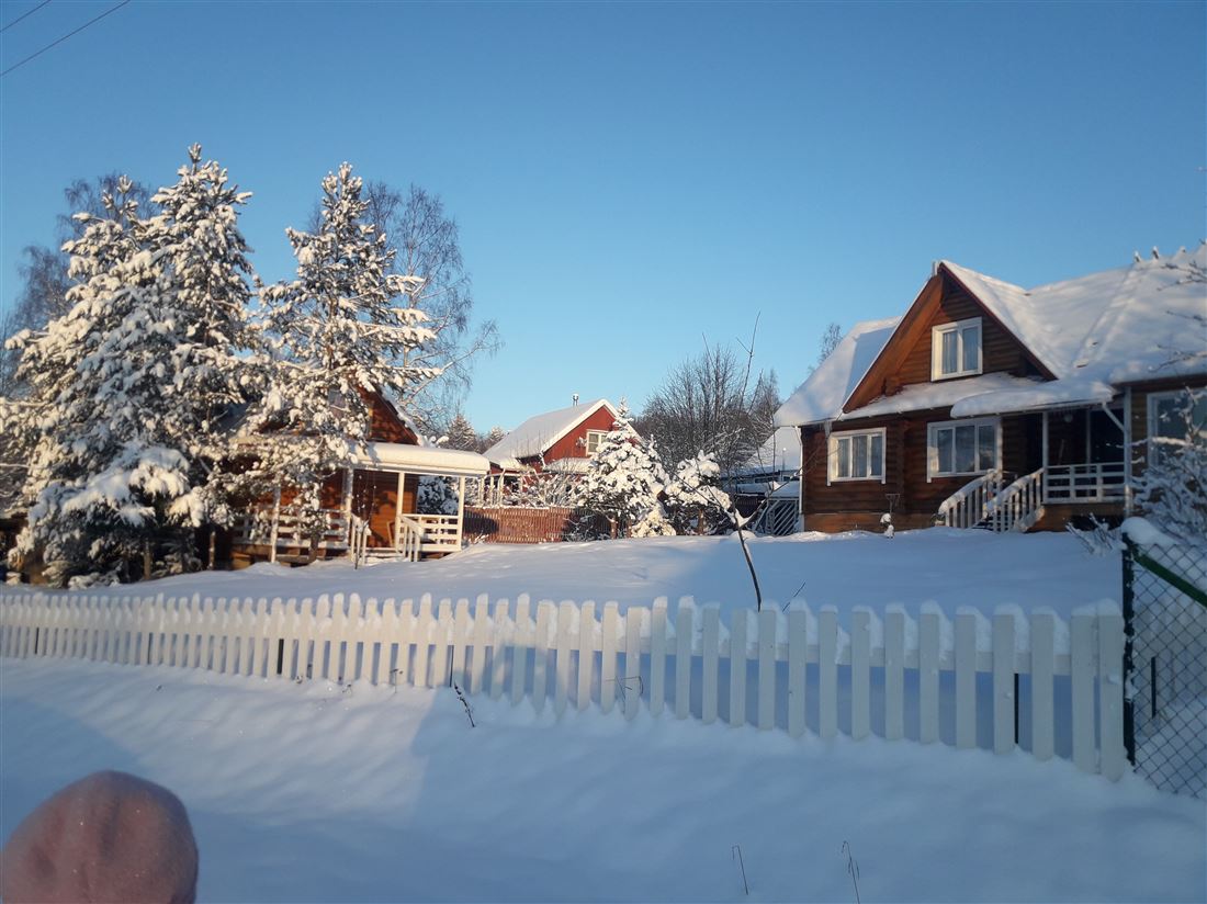 Дом удачно расположен на возвышенности, откуда открывается замечательный вид на соседние окрестности, что дает чувство защищенности и комфорта. На участке имеется лужайка, где вечером на бревенчатой скамейке можно "зависать" до утра, вдыхая чистый воздух и слушая тишину.