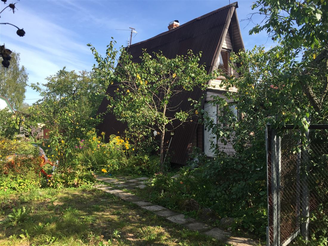 Дом в стиле А-frame, популярный в загородном строительстве по финским проектам антиветровой с крышей с двух сторон. А-образной формы. Каркасно-щитовой. Участок огорожен забором из профлиста и рабицы.