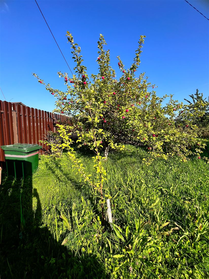 На участке очень много плодовых деревьев и кустарников , участок огорожен забором .