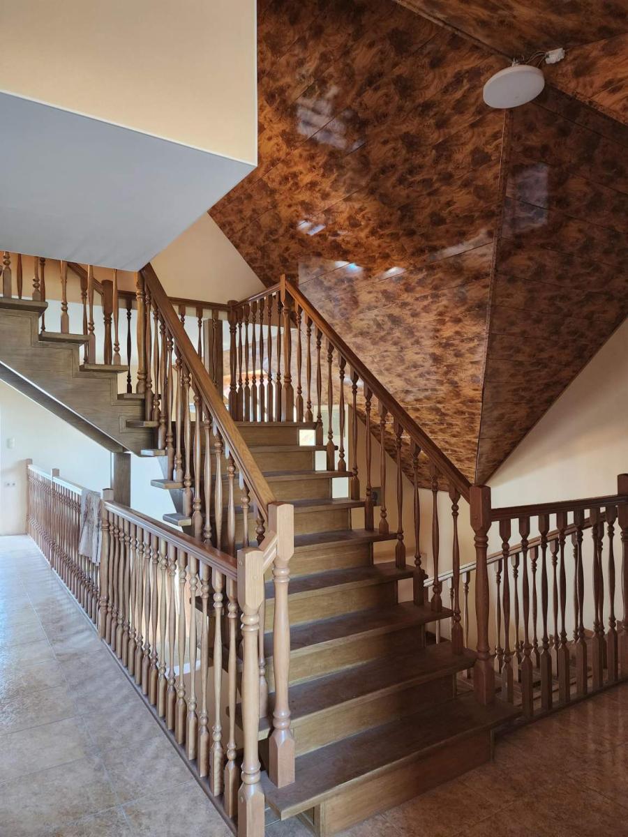 Дом построен в 2012 году по технологии несъёмной опалубки. В цокольном этаже гараж на две машины, бильярдная, кладовая, бассейн. На первом этаже прихожая, комната, зал, с камином. Зал имеет второй свет, высота потолка 6 метров. Столовая, кухня, зимний сад, лоджия 12 кв.м., котельная с одним электрическим котлом и двумя газовыми котлами (один для дома, второй, для бассейна), сауна, душ, туалет. На втором этаже три спальни, гардеробная, ванная комната 26 кв.м., с гидромассажной ванной и душем, лоджия, с гимнастическими тренажёрами. На первом этаже один туалет, на втором два и один туалет в мансарде. Мансарда площадью 49 кв.м. В дом ведут три входа: парадный, второй - хозяйственный, с противоположной стороны и третий, через гараж, в цокольном этаже. Дом расположен на участке 90 соток.