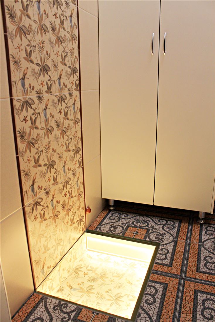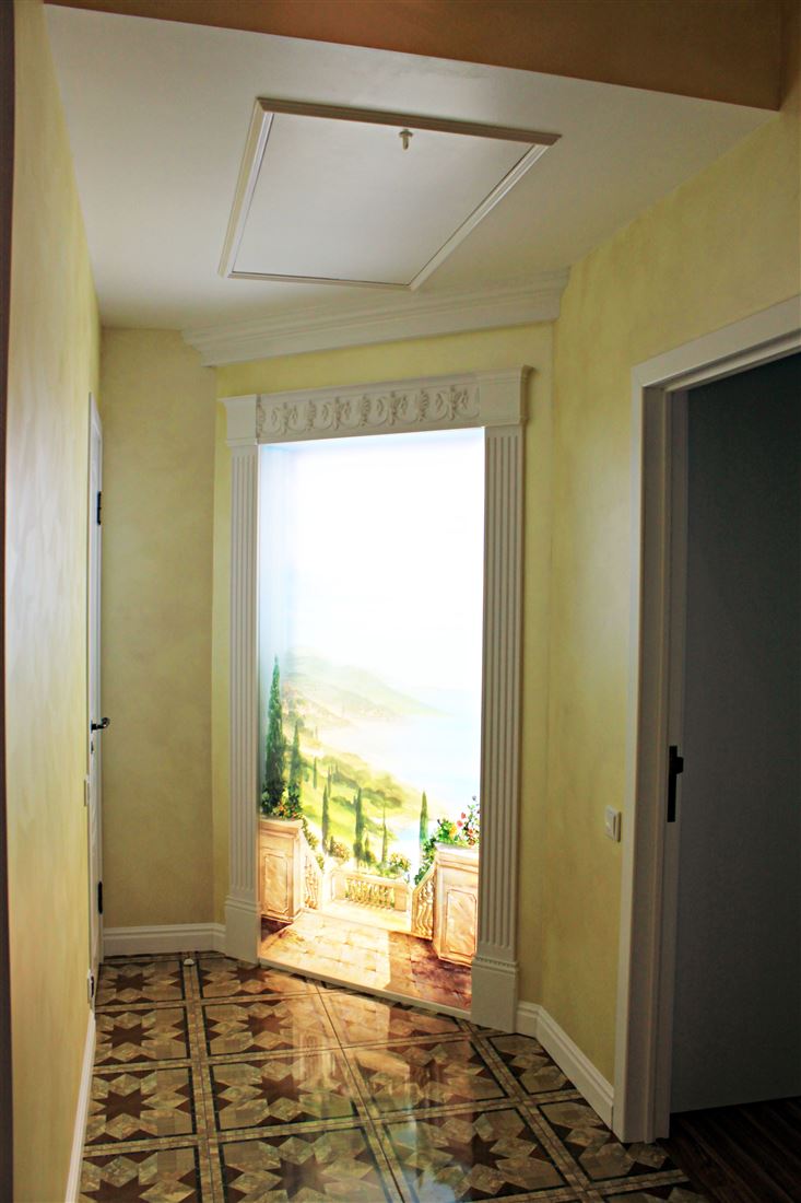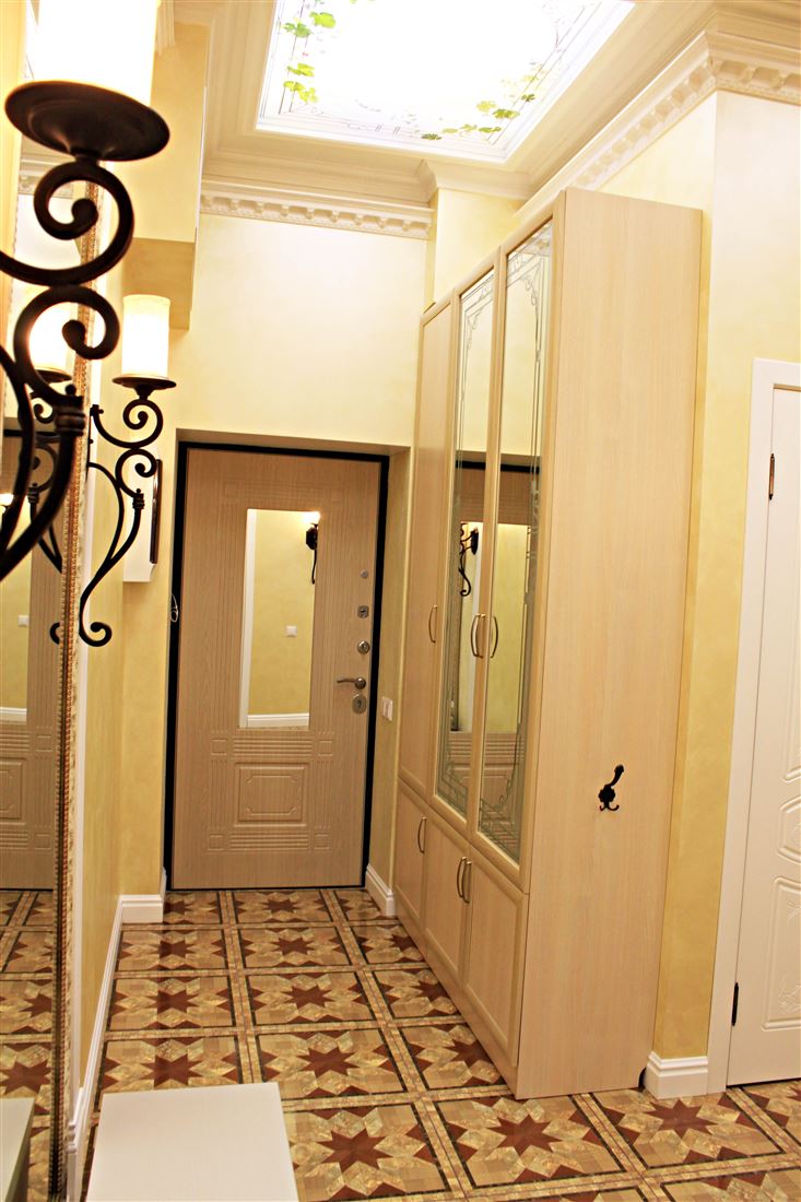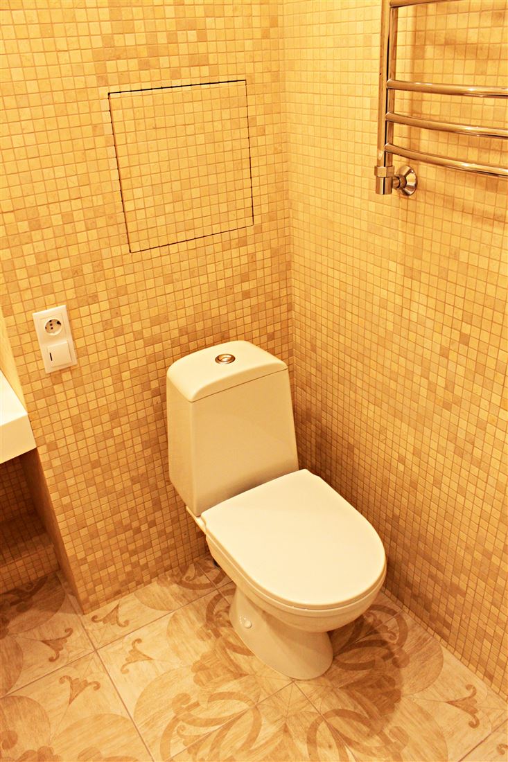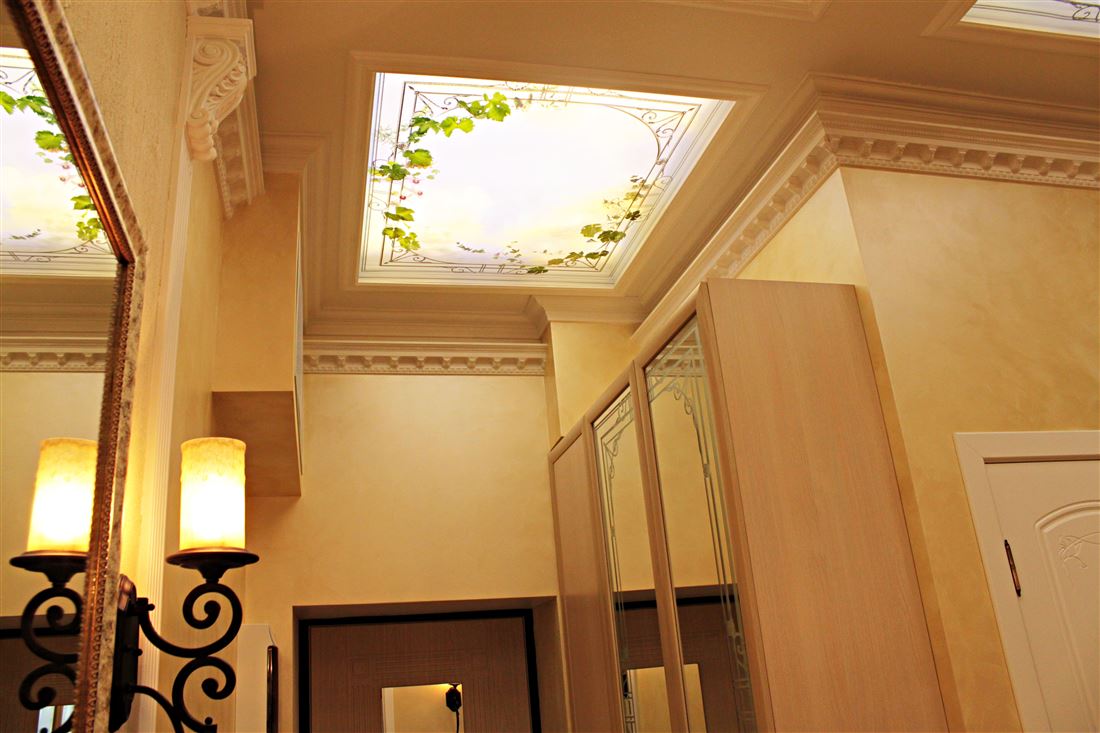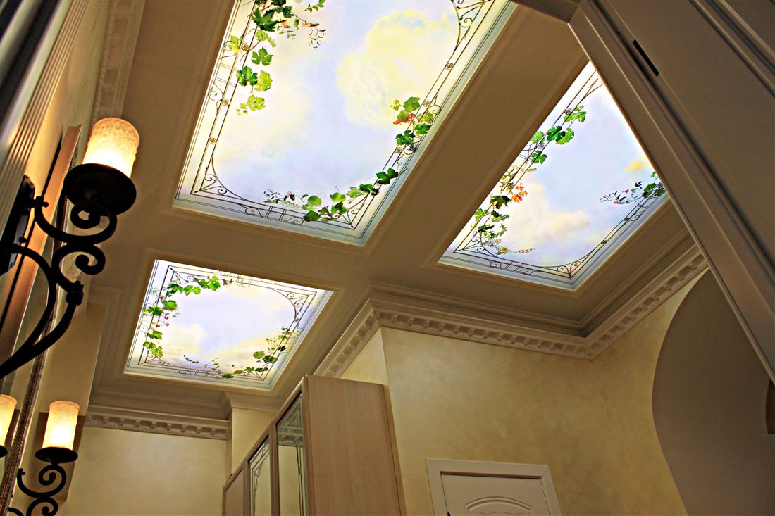 Санузел раздельный, антресоль со складной лестницей. На потолке и рядом с ванной дизайнерские световые панорамные модули написанные индивидуальным художественным специалистом в силе прованс.