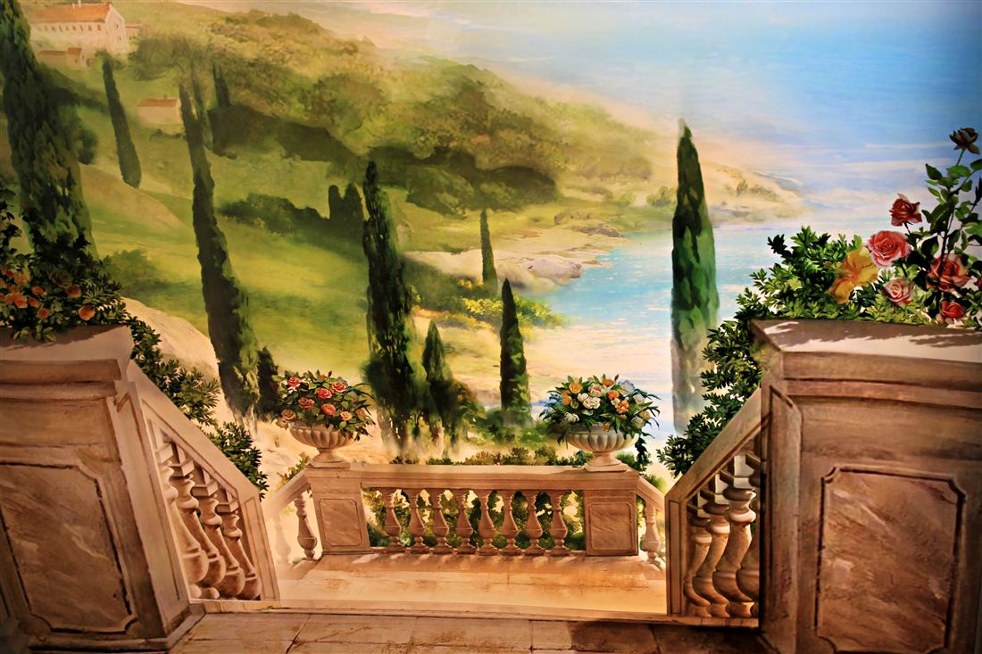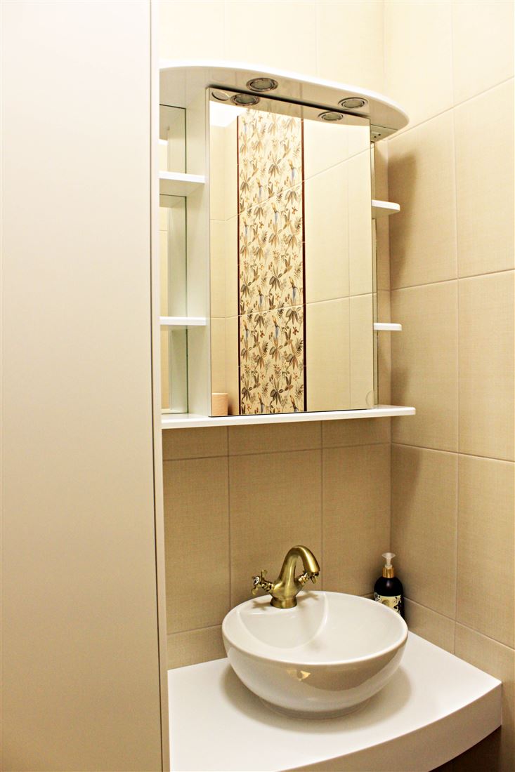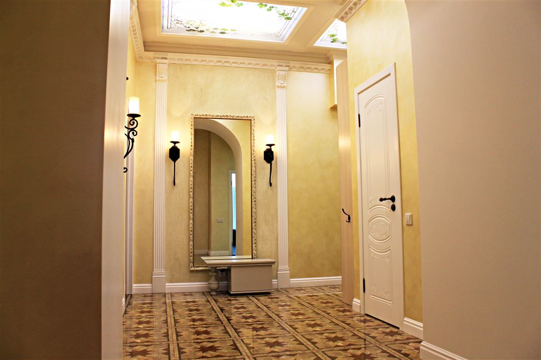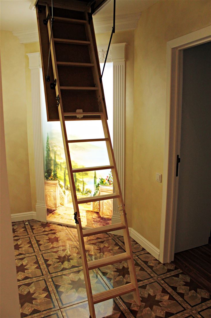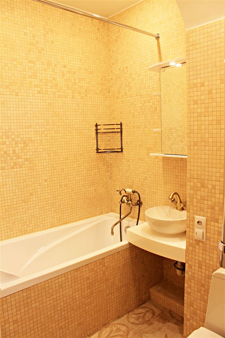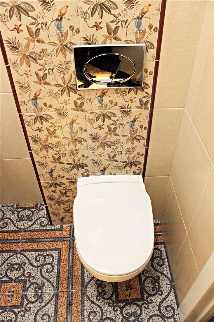 Санузел раздельный, антресоль со складной лестницей. На потолке и рядом с ванной дизайнерские световые панорамные модули написанные индивидуальным художественным специалистом в силе прованс.
