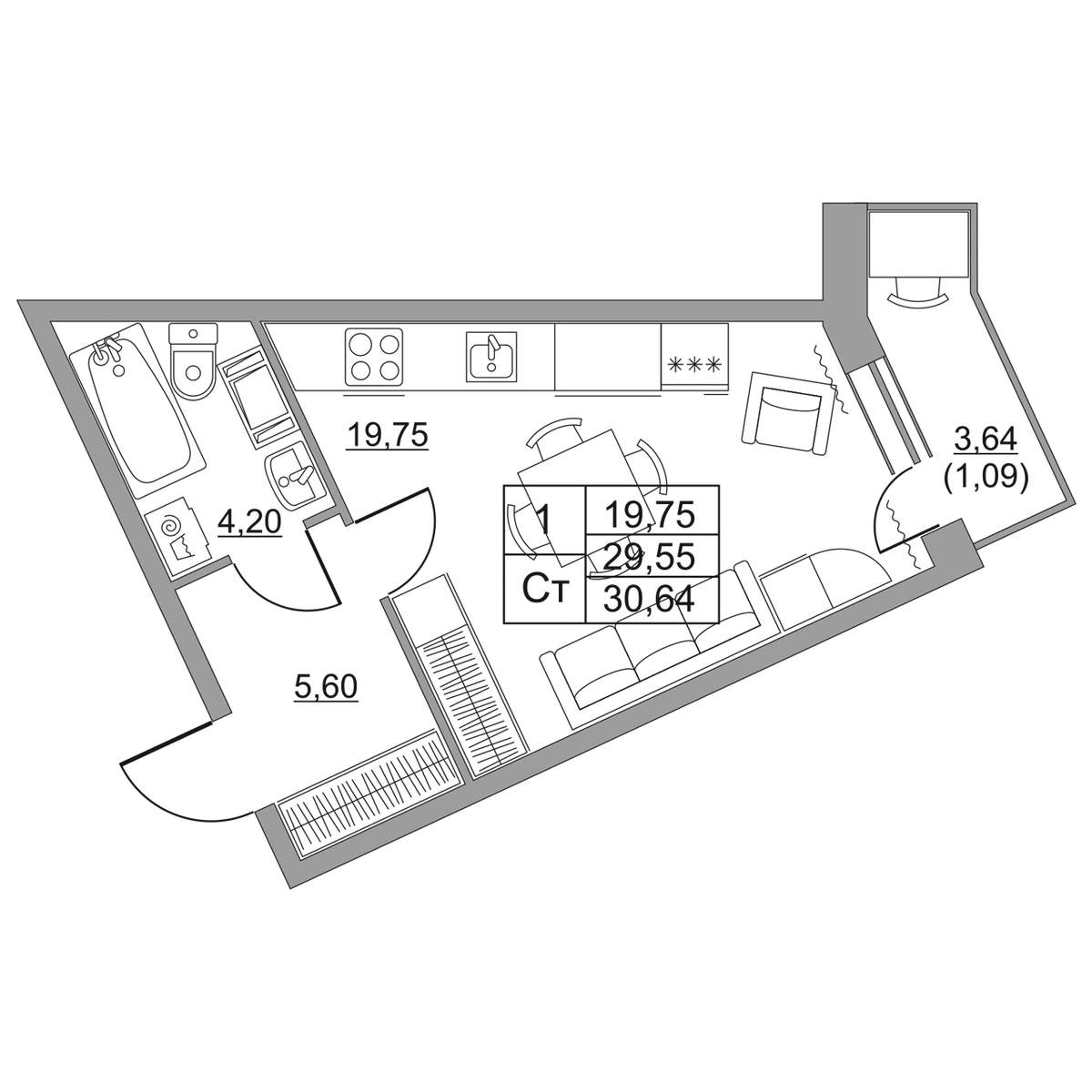 | Жилая площадь | 19.75 кв.м. |