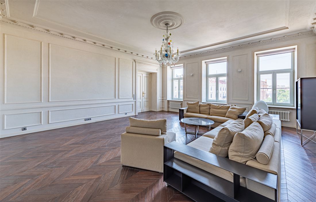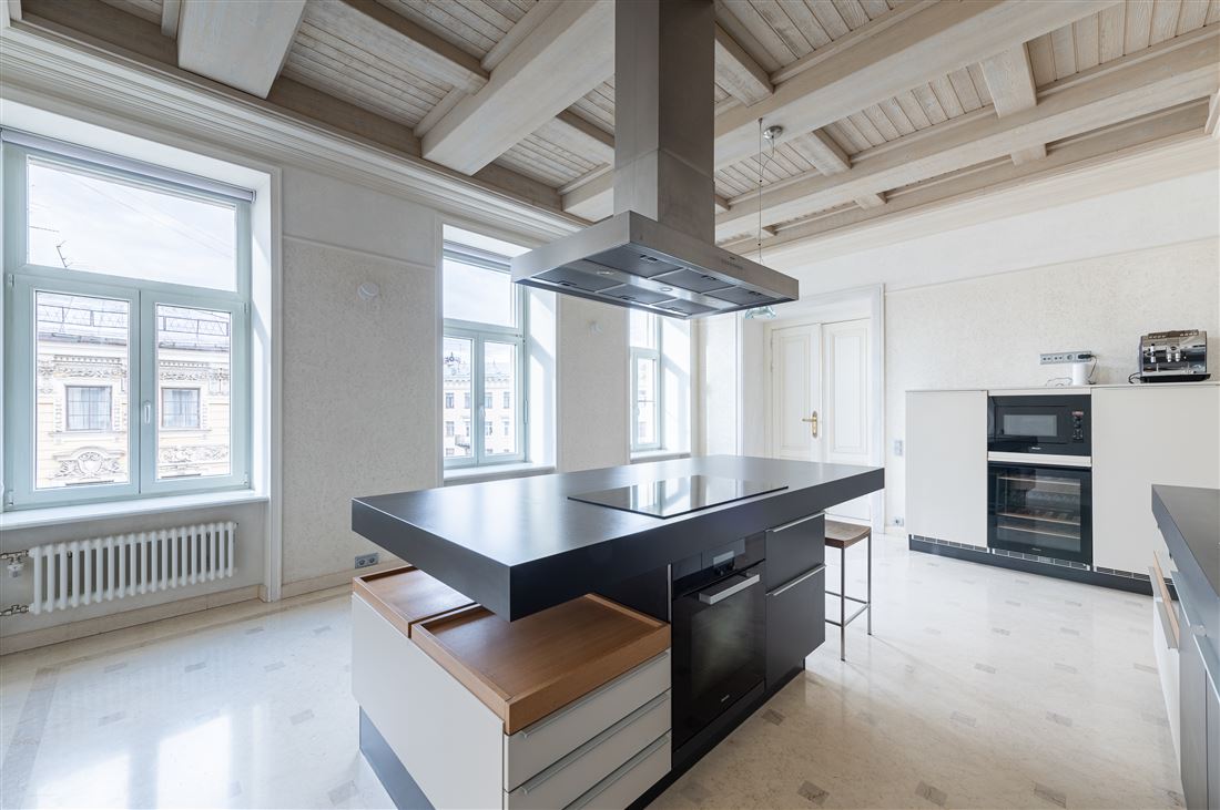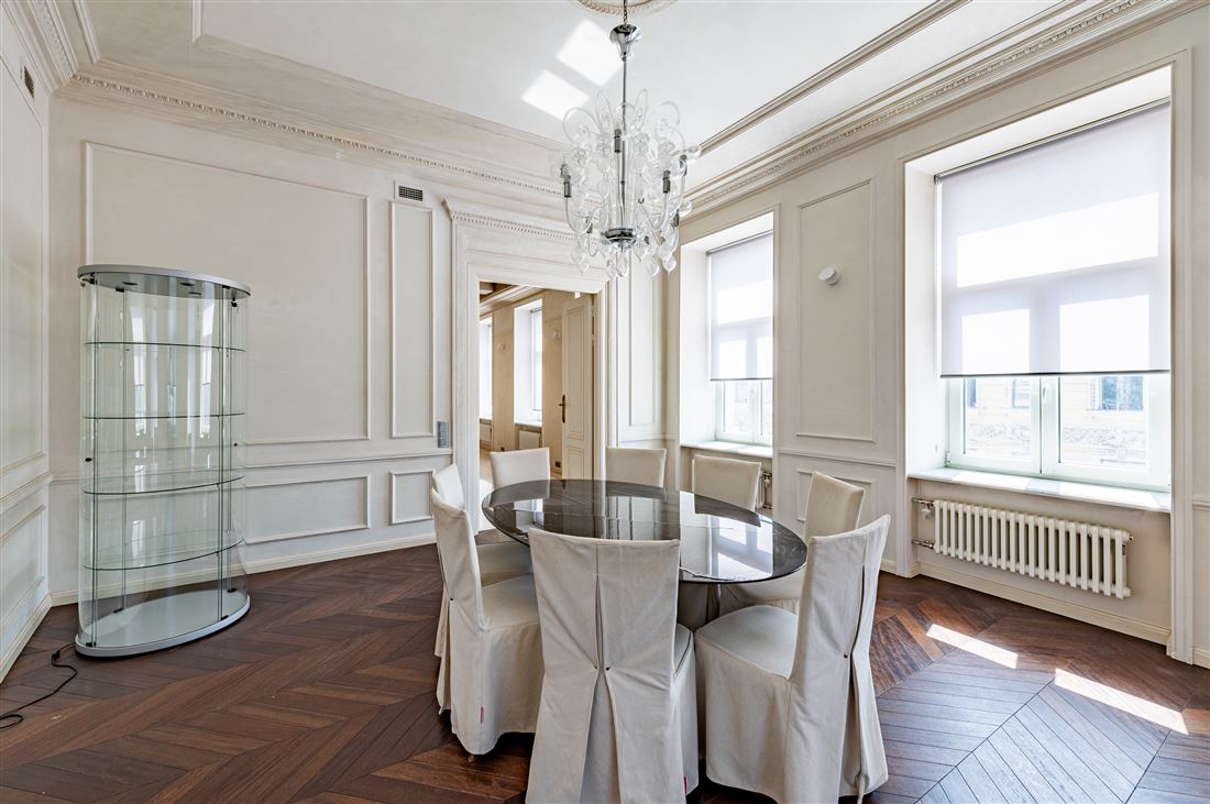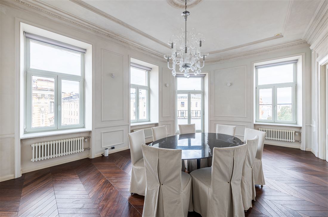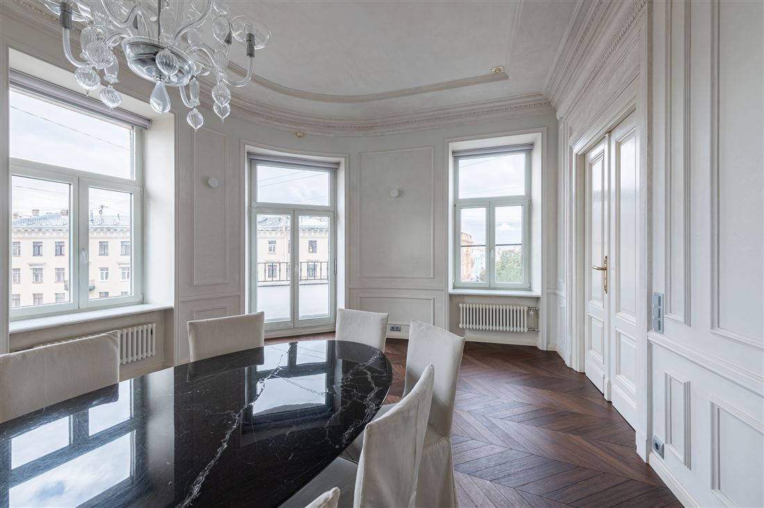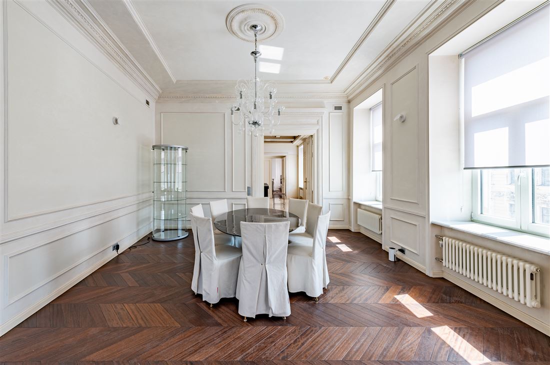 ID в ИМЛС: 47253901 Предлагается к продаже уникальная 6 комнатная двухуровневая квартира площадью 334.5 метров , в доме на Караванной, 16, который входит в ансамбль исторической застройки Манежной площади. Дом Алексина или доходный дом Челпанова в стиле эклектика был возведен в 1875-1878 по проекту архитектора Белова Михаила Ивановича. Дом расположен в центре деловой и культурной жизни Петербурга архитектуры в самом сepдцe «Золотого Tpeугoльникa». Дом окружен парками, скверами, набережными, пешеходными улицами, ресторанами высокой кухни, продуктовыми магазинами премиум-класса.Парадный вход расположен с улицы Караванная, дом после реконструкции, парадная отреставрирована, установлен современный стеклянный лифт, консьерж-сервис, видеонаблюдение. Пространство квартиры органично разделено на три зоны: гостевую, детскую и приватную . находящихся в 2 уровнях . На первом уровне находится гостевая ,кухня-столовая, комната используемая в качестве обеденной зоны, гостевая спальня с действующим камином и ванной комнатой. Гостевая зона начинается с парадного хода в квартиру и просторной прихожей-гардеробной 23.1 кв.м. с собственным окном. Гостиный зал площадью 46.5 кв. м имеет прямой вид на Манежную площадь с фонтаном и перспективы прилегающих улиц. Столовая зона 26.9 кв.м с балконом и кухня-столовая 32,1 кв. м выходят окнами как на Манежную площадь так и на Итальянскую улицу . Стены гостевой зоны в светлых тонах, большое количество освещения и мест для хранения делает ее уютной и комфортной для проживания .Приватный блок расположен на втором уровне квартиры . В этой части квартиры расположены холл 47.5 кв.м, мастер-спальня с гардеробной 39.1кв.м и ванной комнатой 12.1 кв.м, напротив расположена детская комната 18.8 кв.м с собственным санузлом, подсобное техническое помещение , и антресоль с собственным выходом на террасу крыши. Техника Miele. Резервное автономное отопление.Прямая продажа . Торг