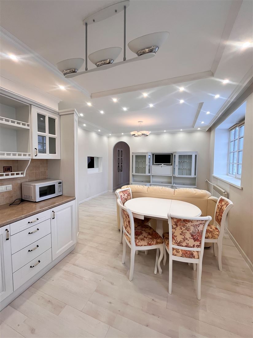 * Потолки двухуровневые, подвесные, с продуманным освещением: множество точечных светильников и стильные люстры создают уютную атмосферу и позволяют регулировать освещение по вашему вкусу.