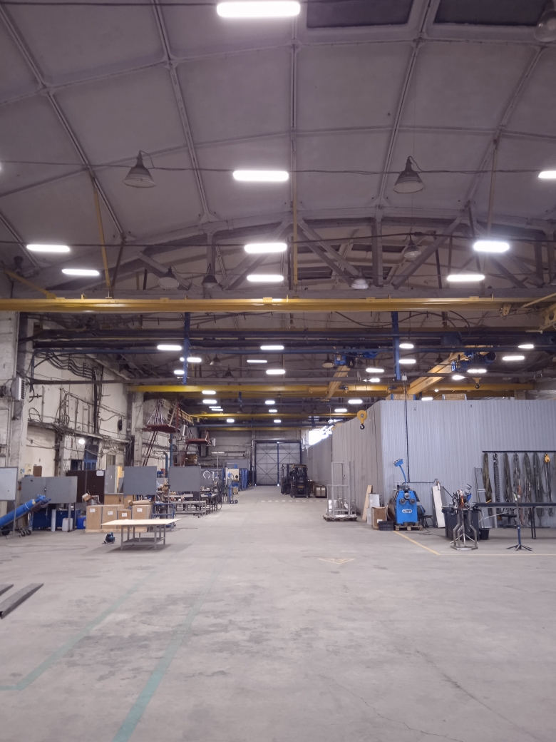 Производственно-складское, теплое помещение, общей площадью 2850 кв.м. (из них 635 кв.м. административные, подсобные помещения – душ, с/у, раздевалки), шаг колонн 18*24, высота потолков 7-12 метров, автоматические роллерные ворота «HORMANN» с калиткой, под еврофуру размером 4,5 м (высота)*4 м (ширина) – 1 шт, распашные двустворчатые ворота размером 5.5 м – ширина*5,5м высота, тепловые завесы – 4 шт, кран-балки на 2 т. каждая в количестве 4 шт. (расположение кранбалок – поперек помещения, высота подъёма груза – 5 метров). Имеются водопровод, канализация, отопление. Полы выровненные, бетонная стяжка с антипылевым покрытием, нагрузка на пол – 5 тонн/кВ.м.