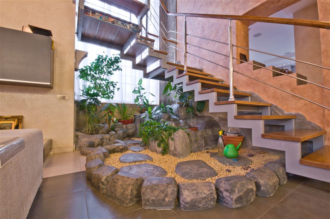 В просторной гостиной с камином оборудован "Зимний сад" с автоматическим поливом растений.